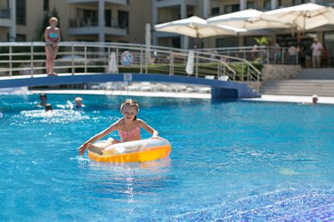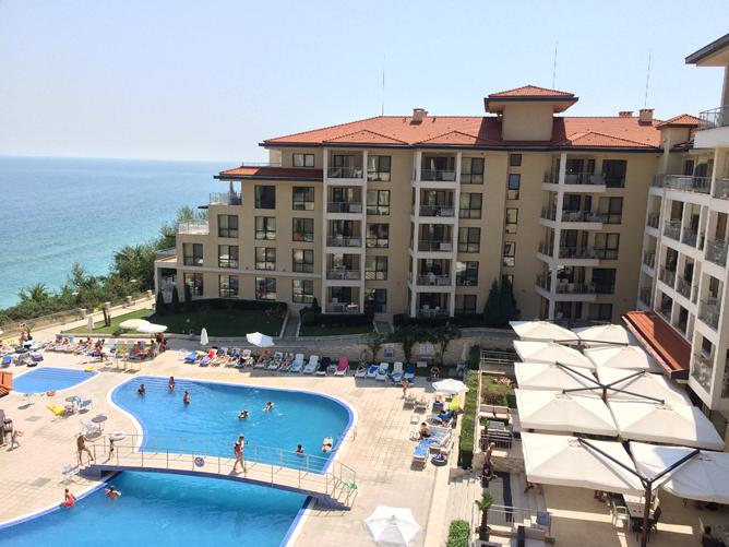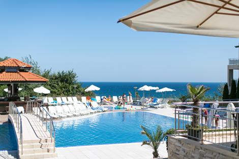 Byala Beach Resort är ett välkomnande och populärt All Inclusive-hotell med fantastiskt läge på en bergsluttning ute vid havet i Byala. Här kan du njuta av härlig atmosfär och många bekvämligheter. Mellan huvudbyggnaden och havet hittar du poolområdet med en stor pool, barnpool, solterrass och poolbar. Här kan du njuta av solen, bada eller delta i de aktiviteterna som hotellets underhållningsteam arrangerar. Stranden nås via en trappa som leder från hotellets poolområde. Du bor i trevligt inredda lägenheter med balkong och välutrustat utrustat pentry. Här kan du koppla av med familjen och de största lägenheterna rymmer upp till åtta personer. Boendet är med All Inclusive, där måltider, snacks och drycker ingår i priset. Du kan också boka boendet utan pension, om du föredrar att laga ennklar måltider i pentryt. Byala Beach Resort är ett av våra mest populära hotell i Bulgarien och vi rekommenderar det för vuxna och barnfamiljer som vill fira semester i bekväm miljö med en fantastisk utsikt.