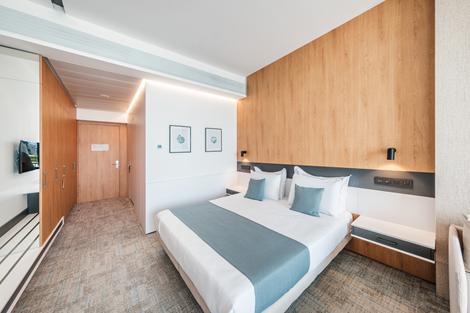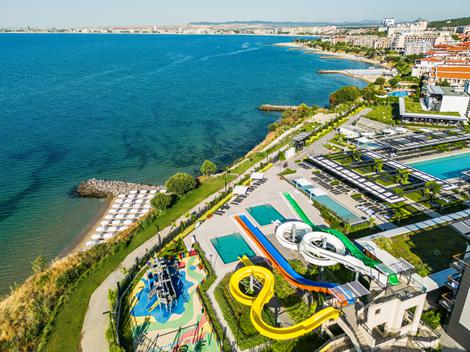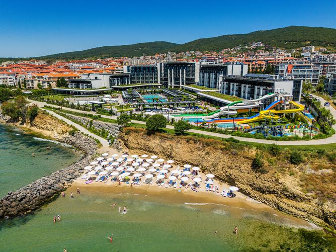Excellent Voya Beach Resort är ditt lyxiga boende under din semester i Sveti Vlas. Oavsett ålder kommer du att ha underbara dagar här. För barnen finns en barnklubb där nöje står högst upp på listan. Du själv kan koppla av på den härliga sandstranden eller på solstolarna vid poolen. Härifrån har du bra överblick över barnen som åker vattenrutschbanorna.För den ultimata avkopplingen är Voya Beach Resort platsen att vara på. Njut av det turkiska ångbadet, ta en behandling i hamamen eller koppla av i bastun. Är du mer för aktivitet? Besök gymmet eller utmana någon på tennisbanan. I de olika restaurangerna kan du njuta av de mest läckra rätterna och äta så mycket du vill hela dagen. Förutom de allmänna restaurangerna och barerna finns det också två à la carte-restauranger där du kan välja mellan bulgariska och internationella rätter. Om du vill komma bort en stund tar det endast fem minuter med taxi till Sveti Vlas hamn med sina restauranger och butiker. Om du fortsätter ytterligare 20 minuter kommer du till Sunny Beach centrum. I centrala Sveti Vlas hittas ett bra utbud av restauranger och barer, särskilt i området runt stadens marina finns flera mysiga barer. Hamnen är också en härlig plats att ta en mysig promenad. Här ligger stora yachter sida vid sida med små fiskebåtar, och under sommaren lägger även kryssningsfartyg till här och erbjuder bad- och snorklingsutflykter till havs.