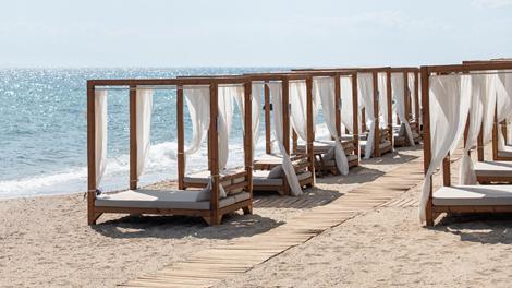- Vid stranden (sandstrand, solstolar, parasoll)