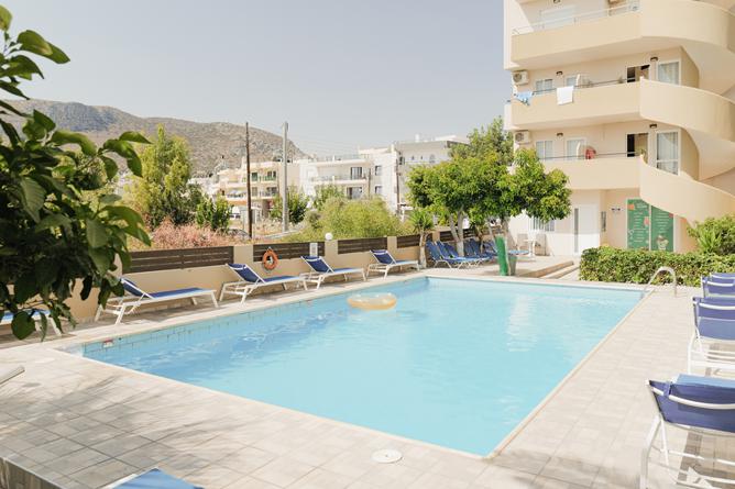 På Minas Apartments i Hersonissos bor du på det perfekta stället om du vill bo nära havet och mitt i det livliga centrumet. Bara några steg bort hittar du bargatan och här finns ett myller av barer och restauranger. Minas drivs av en varm grekisk familj, vilket omedelbart skapar en trevlig och lokal atmosfär. Börja dagen med ett svalkande dopp i poolen och njut av den värmande grekiska solen. Närmaste strand hittar du ca 150 meter ifrån ditt boende. Inga måltider ingår. Lägenhetshotellet har en snackbar som serverar b la kylda drycker, kaffe, öl/vin och enklare rätter.