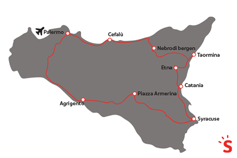 Fly & Drive Charmiga Sicilien är en rundresa med imponerande höjdpunkter. Du kommer att upptäcka öns vackraste platser och sevärdheter, lära känna lokala specialiteter och uppleva gamla traditioner. Dag 1: Ankomst till Palermo På Palermos flygplats hämtar du din hyrbil och kör till ditt boende i Palermoområdet där du övernattar. Dag 2: Monreale och Palermo Idag börjar din rundresa på riktigt och denna dag är tillägnad huvudstaden på denna vackra ö. Palermo är känt för sina viktiga historiska monument, som den imponerande normandiska katedralen i Monreale och den makabra kryptan i kapucinerklostret med mer än 5 000 mumifierade kroppar. Du kan också besöka Cappella Palatina som ligger gömd i Palermos kungliga palats, katedralen och kyrkorna La Martorana och San Cataldo. Och för att fullända ditt intryck av Palermo kan du strosa runt på de färgglada och livliga marknaderna och smaka på traditionell gatumat som arancini, sphincione och panelle. Boende nära Palermo. Dag 3: Agrigento En av Siciliens mest kända historiska sevärdheter är utan tvekan Tempeldalen, strax utanför Agrigento. Denna vackra arkeologiska park består av åtta tempel och diverse andra lämningar. Mellan templen Dioscuri och Vulcano ligger Giardino della Kolymbetra. I skuggan av templen kan du vandra genom den lummiga dalen i den antika trädgården. Efteråt kan du tillbringa dagen på en av världens mest unika stränder vid de kritvita klipporna i La Scala dei Turchi. Boende i närheten av Agrigento. Dag 4: Piazza Armerina och Syrakusa Idag kör du förbi den intressanta staden Piazza Armerina med ett medeltida centrum. Här rekommenderar vi att du tar en titt på utgrävningarna av en romersk villa med en vacker mosaikbeläggning. Efteråt besöker ni även Syrakusa, Magna Graecias viktigaste stad. Det finns mycket att se och göra i denna vackra hamnstad som omges av Medelhavet: staden har ett historiskt centrum med den berömda katedralen Ortigia och fontänen Arethusa, en stor terrass med utsikt över havet, smala pittoreska gator och ett tidigare arabiskt kvarter. Men ett besök på den färgglada dagliga marknaden och den arkeologiska parken är också värt besväret. Boende nära Syrakusa. Dag 5 och 6: Etna och Taormina Idag är det dags att utforska Europas högsta aktiva vulkan, Etna. På vägen till stationen Rifugio Sapienza på 1900 meters höjd kommer du att möta underbart varierande landskap, inklusive de bisarra lavalandskapen. Det är också möjligt att åka linbana eller minibuss med 4WD till en höjd av 2900 meter där man kan se de slocknade kratrarna. Naturligtvis kan du också njuta av Taormina som är vackert beläget på en klippig udde högt över havet. Här hittar du restaurerade medeltida byggnader, hisnande vyer i varje hörn och en mängd slingrande gator. Boende nära Taormina/Letojanni/Katanien. Dag 7: Nebrodibergen och Cefalù Idag kör du längs de snabbt föränderliga landskapen över Nebrodibergen. Imponerande gröna dalar och en rad smala kurvor öppnar vägen till hisnande panoramabilder, vackra sjöar och charmiga sicilianska byar med gamla traditioner och fascinerande platser i vacker natur. I den lilla staden Linguaglossa kan du njuta av lokala traditioner och intensiva smaker som det lokala vinet, färsk fläskkorv och mandelbakelser. Besök också Randazzo, den stad som ligger närmast Etna. Denna stad kännetecknas av färgen på sina byggnader som byggts med mörka lavablock. Missa inte heller den lilla staden Cefalù med sin fiskehamn och katedral! Avsluta dagen här på en av de pittoreska terrasserna över en utsökt kopp espresso. Boende nära Palermo. Dag 8 Från Palermo till flygplatsen Dags för hemfärd.