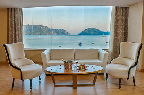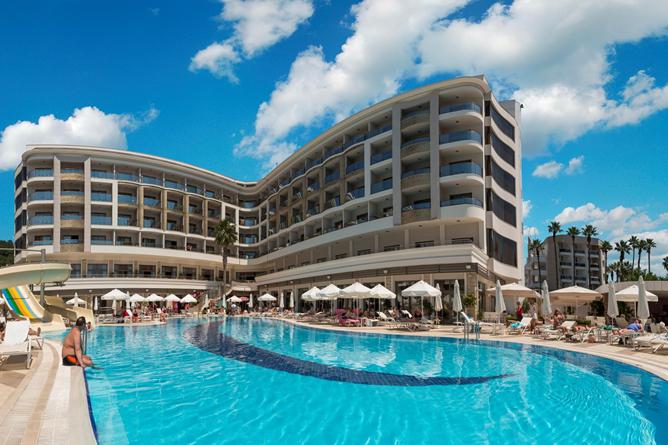 Elegant hotell med bra läge vid stranden Välkommen till Golden Rock Beach, din biljett till en strålande semester i soliga Marmaris. Detta eleganta hotell kombinerar bekvämt läge med fantastiska bekvämligheter och en varm atmosfär. Strand & pool Med en imponerande pool och stranden precis utanför dörren är det sol och bad som kommer att dominera din semesteragenda. För de små finns en underhållande miniklubb, vilket ger dig möjlighet att koppla av med en bok i solen medan de har det roligt. Och när det är dags att kyla av dig, är den fängslande rutschbanan redo för spänning. Mat & dryck Ditt kulinariska äventyr på Golden Rock Beach är en upplevelse i sig. Hotellet erbjuder ett utbud av restauranger där du kan utforska olika smaker och rätter. Oavsett om du föredrar internationella rätter eller traditionell turkisk mat, kommer du att hitta något som tillfredsställer din aptit. Omgivningarna Fantastiska Marmaris erbjuder en lång och härlig strandpromenad som är perfekt för både avkopplande kvällspromenader och tidiga joggingturer. I gamla stan och hamnområdet råder ett livligt myller av restauranger, barer, shopping och folkliv.